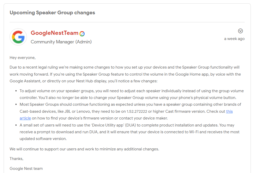 Why did Google disable adjusting the volume of speaker groups?