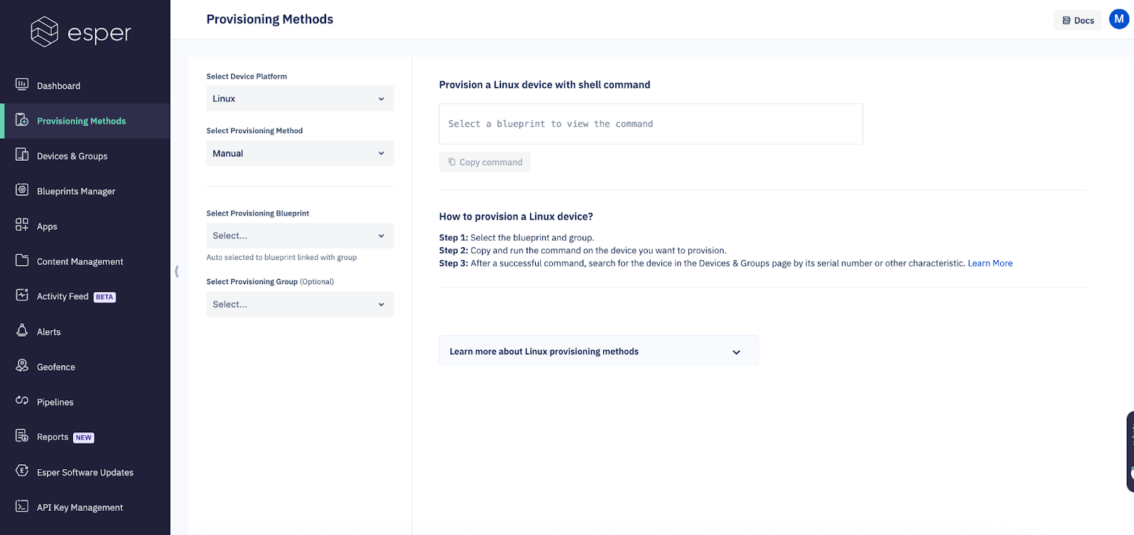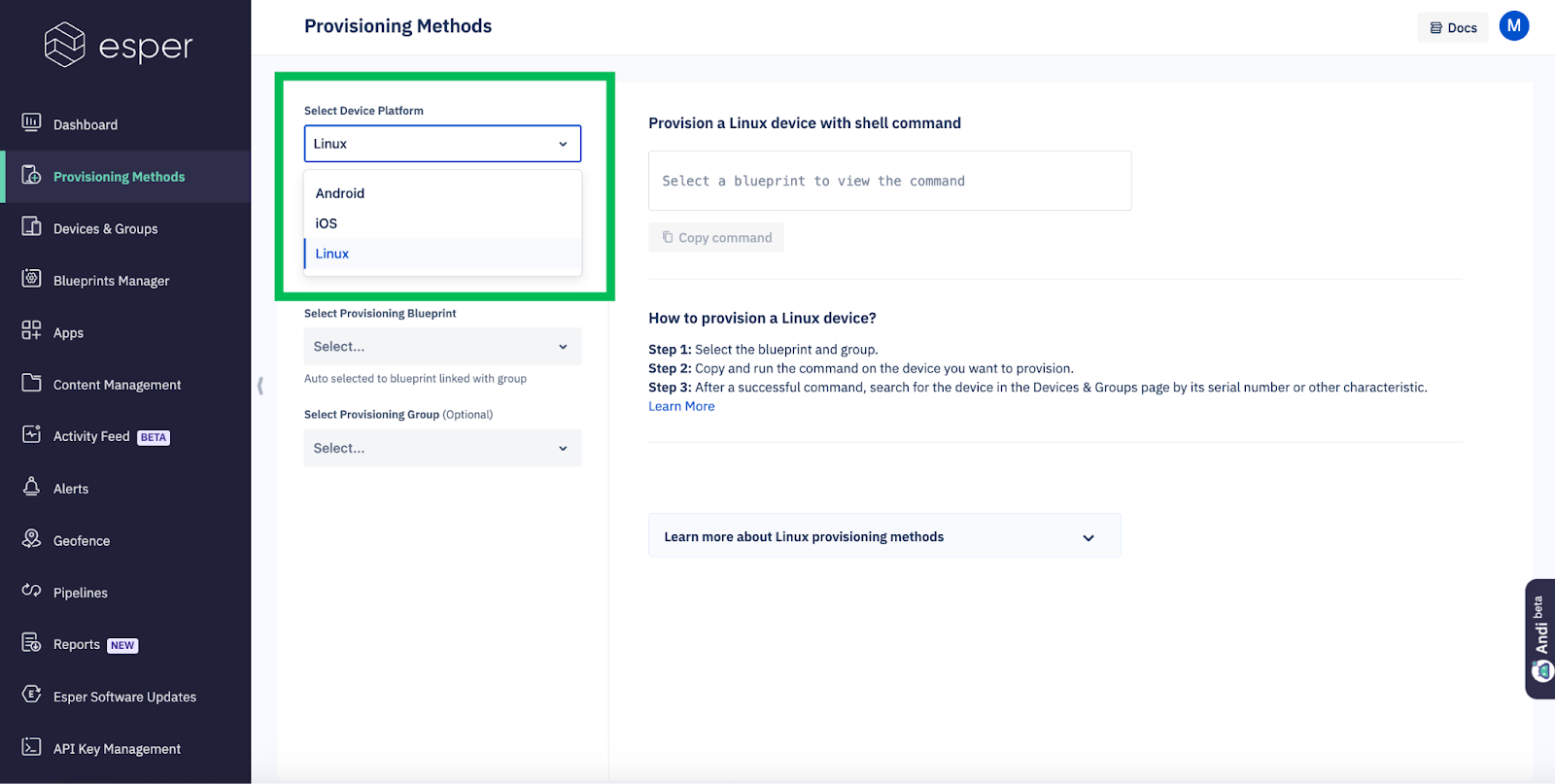 Linux Device Management is offered on a per-device basis for all Esper users. To get started, log in to the Esper console, go to Provisioning Methods, and select Linux from the Device Platform menu.