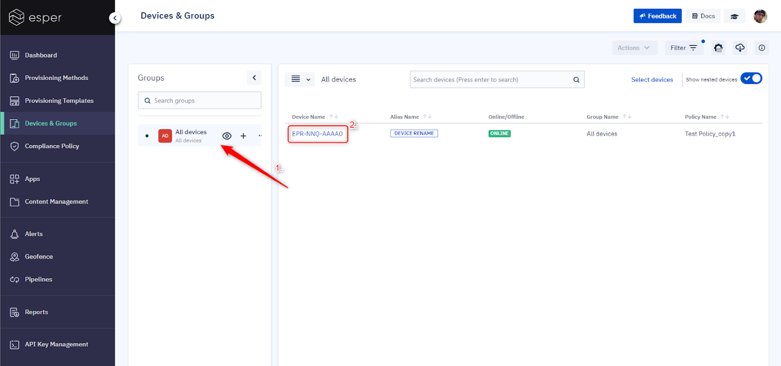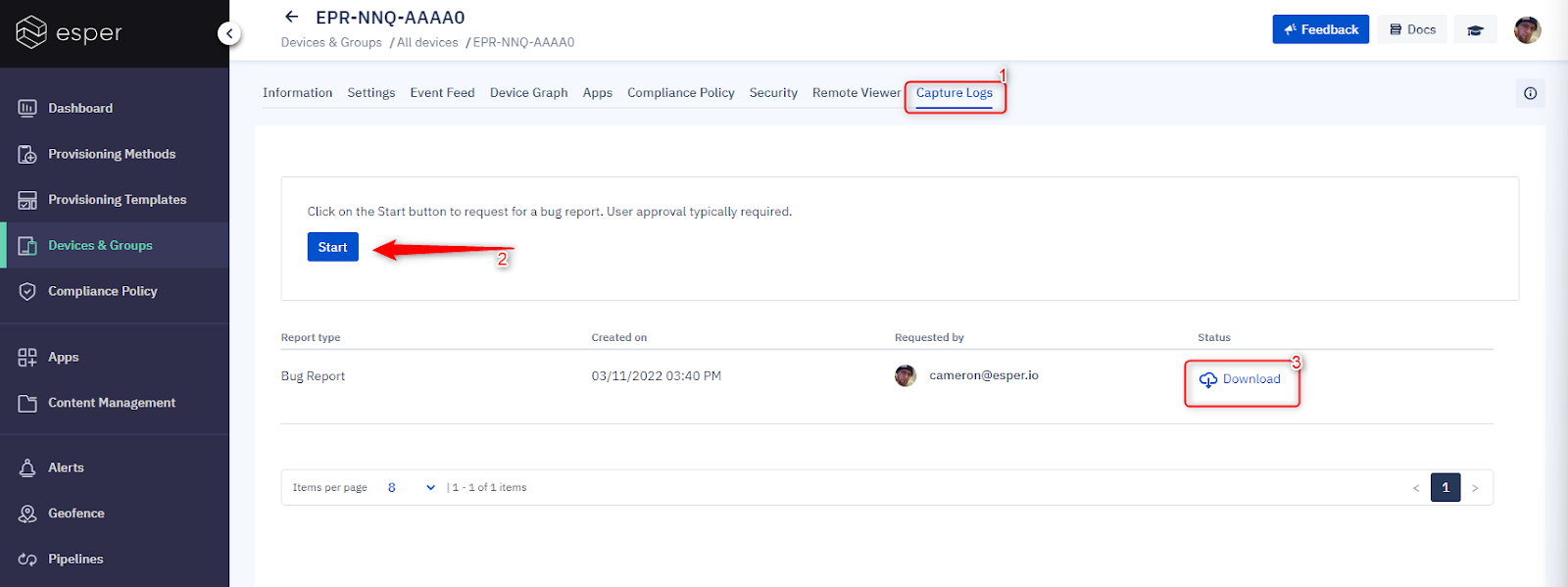 Esper also has a few other tools to apply, like remote viewing and log capturing. First, pop into the Esper Console and click on Device & Groups. Choose the group the device belongs to, then click on that device.