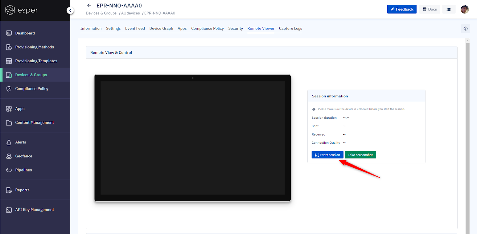 Suppose you’re looking at a device where the device manufacturer has signed Esper’s remote control plugin (which we are happy to get done for you for your devices) or is running Esper Foundation for Android (Foundation). In that case, you can fully control the device using the Start Session option on the right side.