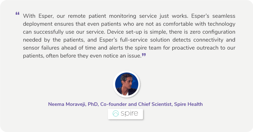 Working with Esper, Spire Health gained the foundation they needed to build a digitally-native healthcare monitoring solution, and sprinted from pre-launch to thousands of devices in the field.
