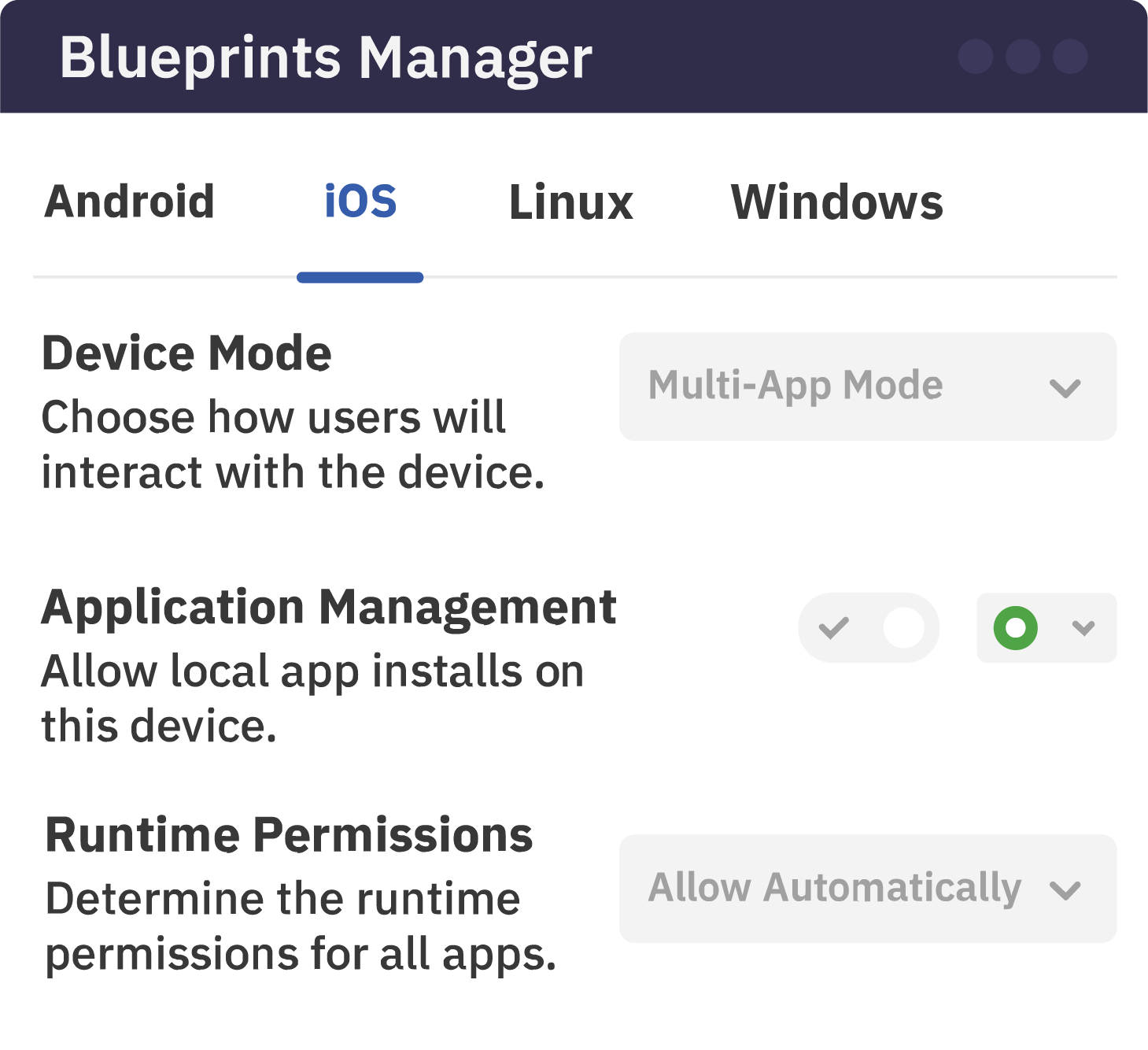 Lock devices to a single app or small group of apps with robust, unbreakable kiosk mode. This hardened, enforced mode ensures everyone is confined to the walled garden you set.